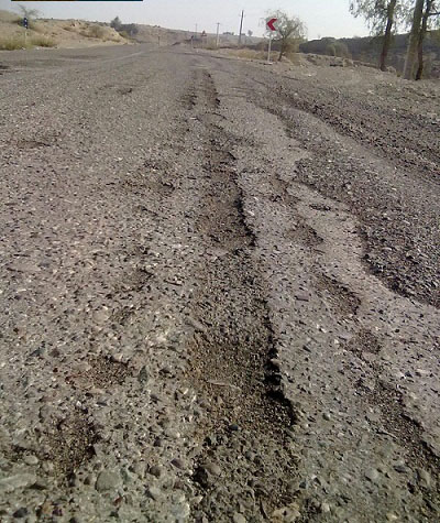 وضعیت نامناسب آسفالت جاده فنوج به ایرانشهر به علت آسفالت فرسوده وغیرقابل
